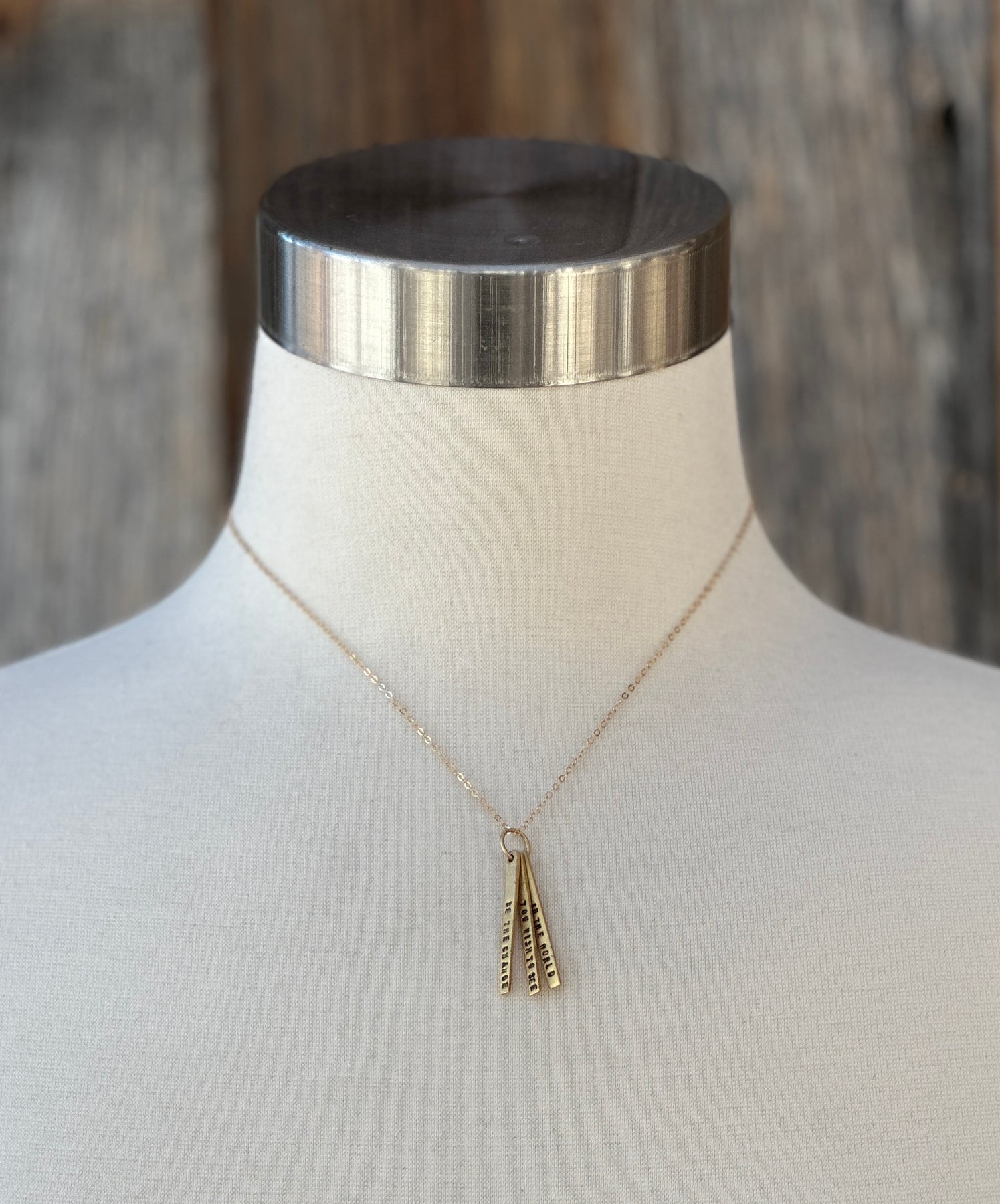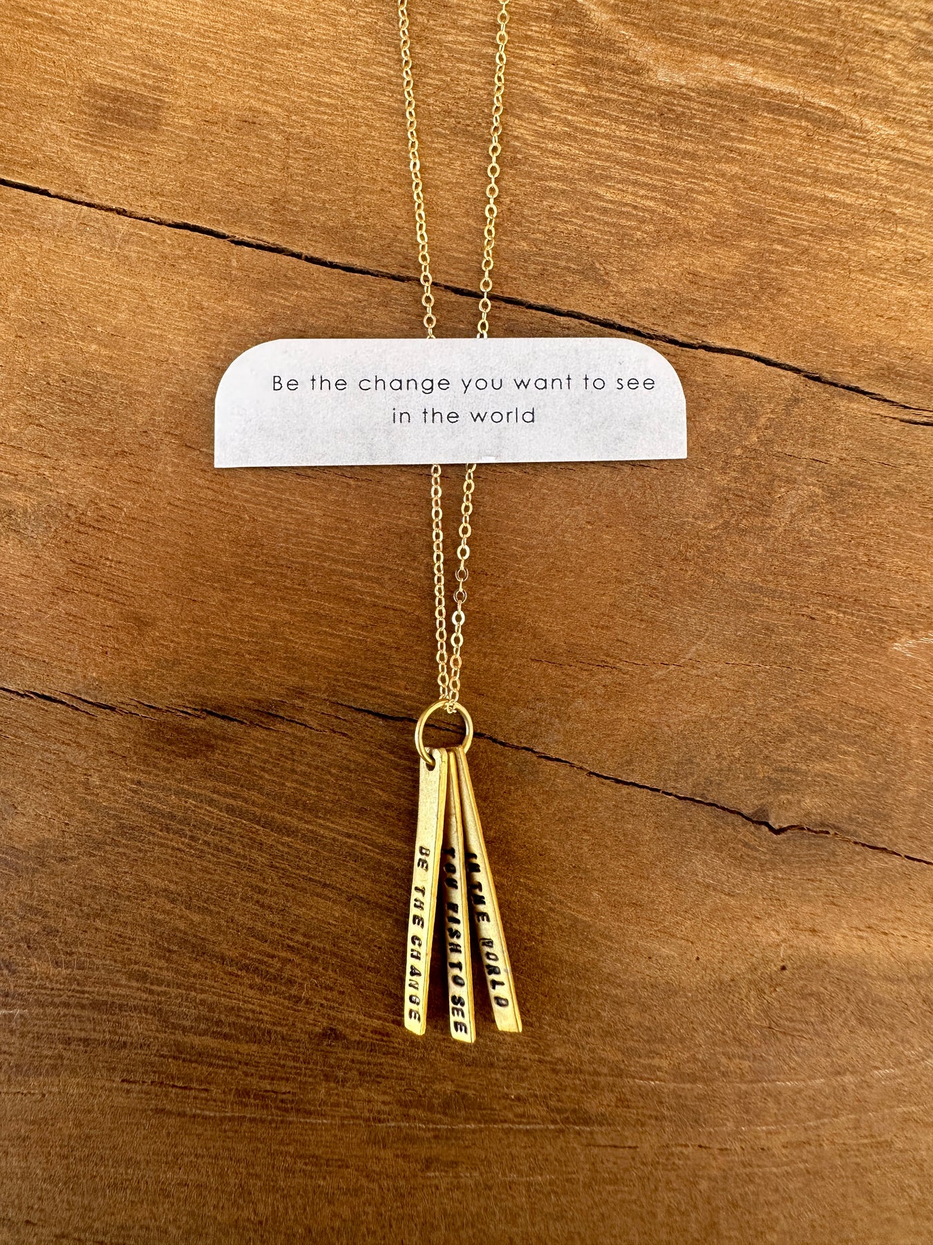"Be the Change You Wish to See In the World". 3 bar quote necklace. As a man changes his own nature, so does the attitude of the world change towards him. This is the divine mystery supreme. A wonderful thing it is and the source of our happiness. We need not wait to see what others do.