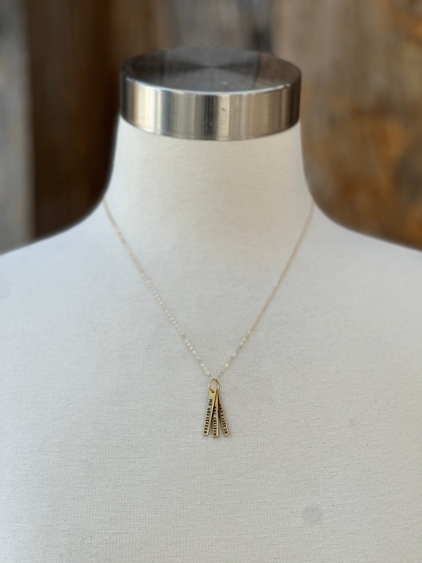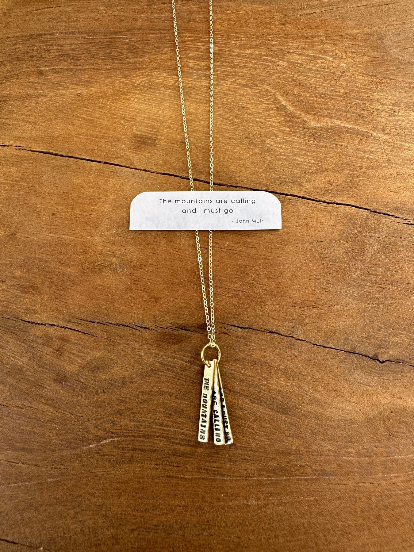 Handmade hand stamped quote necklace that reads " The mountains are calling and I must go." - John Muir. John Muir also known as "John of the Mountains" and "Father of the National Parks."