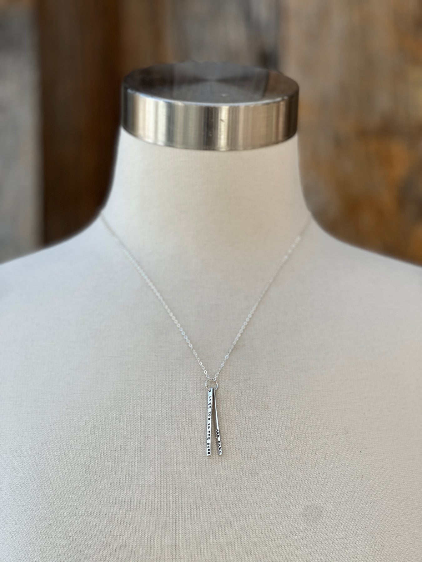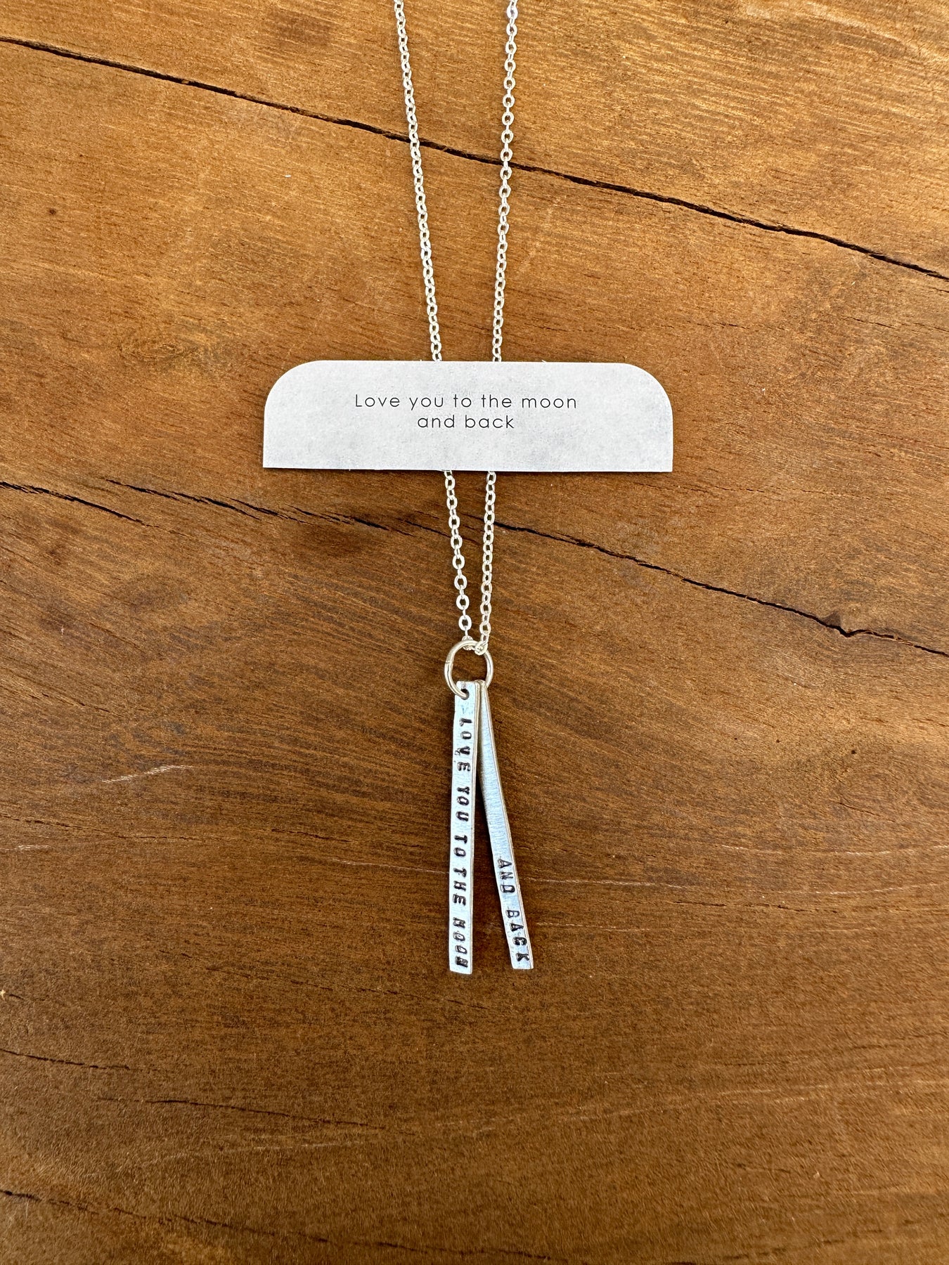 The necklace features 2 bars with the quote stamped on each bar. Each pendant measures approx 1/8" x 1 1/4"